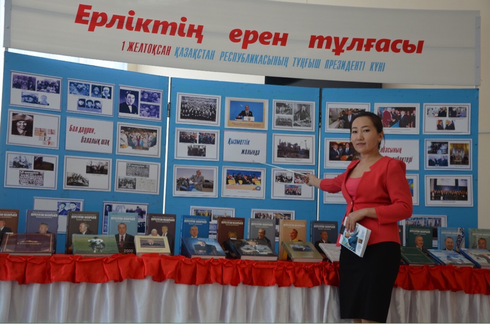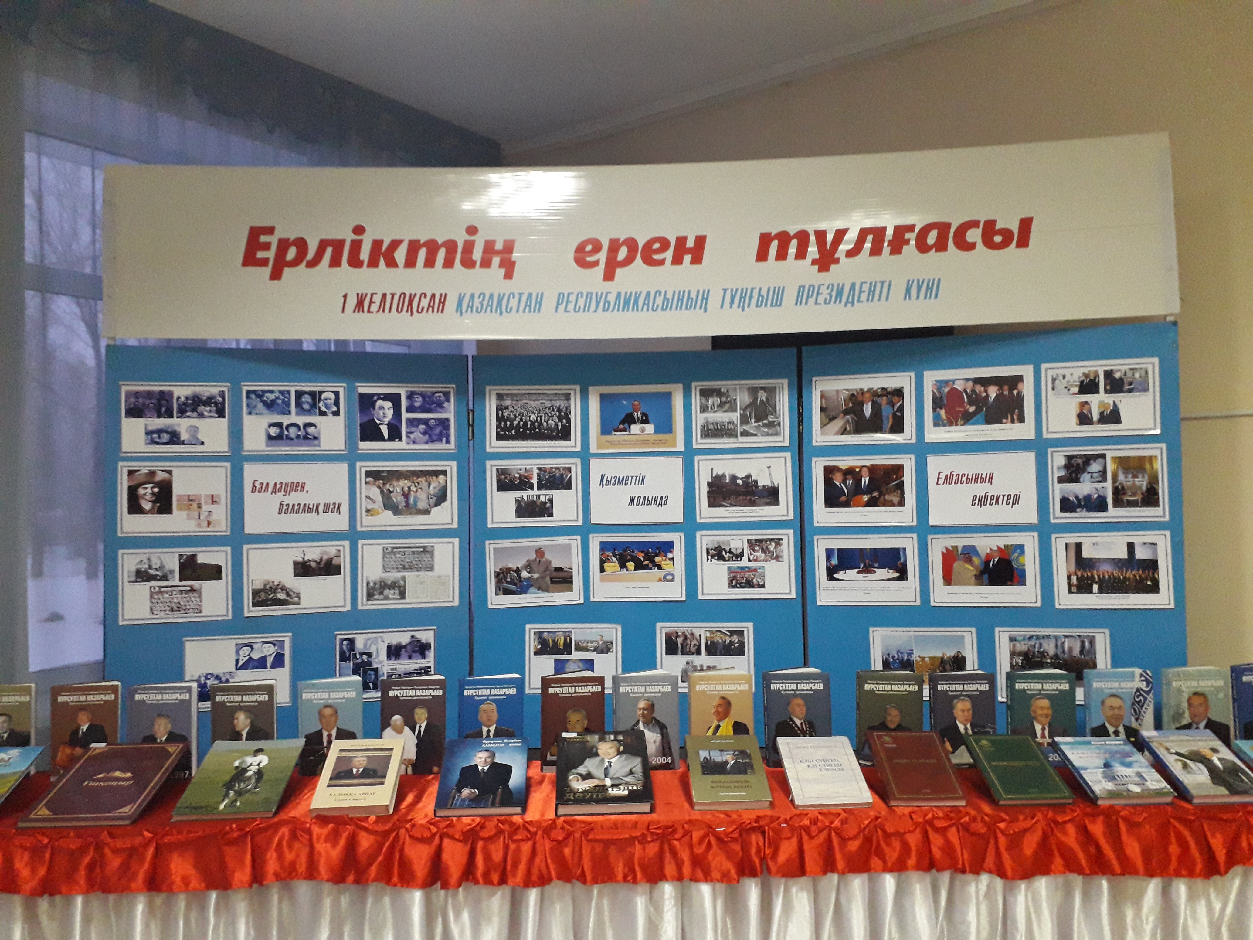 Өйткені, дәл осы күні Қазақстан халқы жалпыұлттық сайлау барысында ел тағдырын Нұрсұлтан Әбішұлы Назарбаевтың қолына сеніп тапсырған болатын. Биыл, міне, Қазақстан халқы бұл мерекені жетінші мәрте атап өтуде. Тұңғыш президент күні еліміз үшін айтулы мереке. Бұл күн елбасы Нұрсұлтан Әбішұлы Назарбаевтың басшылығымен жеткен жетістіктері мен әлем алдындағы жинаған абырой – беделіне тағы да бір мәрте ой жүгіртіп, қорытынды жасайтын күн. Осы мерекеге орай Аудандық орталық кітапхананың ұйымдастыруымен «Ерліктің ерен тұлғасы» атты кең көлемде суретті – кітап көрмесін ұйымдастырды. Көрме 3 бөлімнен тұрады. Көрме мақсаты : Елбасы жайлы жан –жақты мәлімет беру және саясаткердің еңбегіне шолу жасау әрі насихаттау. Көрмеге Елбасының балалық бал дәурен, шағынан бастап, қызметтік, өсу кезеңдері, жеткен жетістіктері жайлы материалдар топтастырылды. Кітапхана қорындағы Елбасының еңбектері және ол туралы шетел саясаткерлерінің пікірлері жайлы еңбектер қойылып, ел назарына ұсынылды.