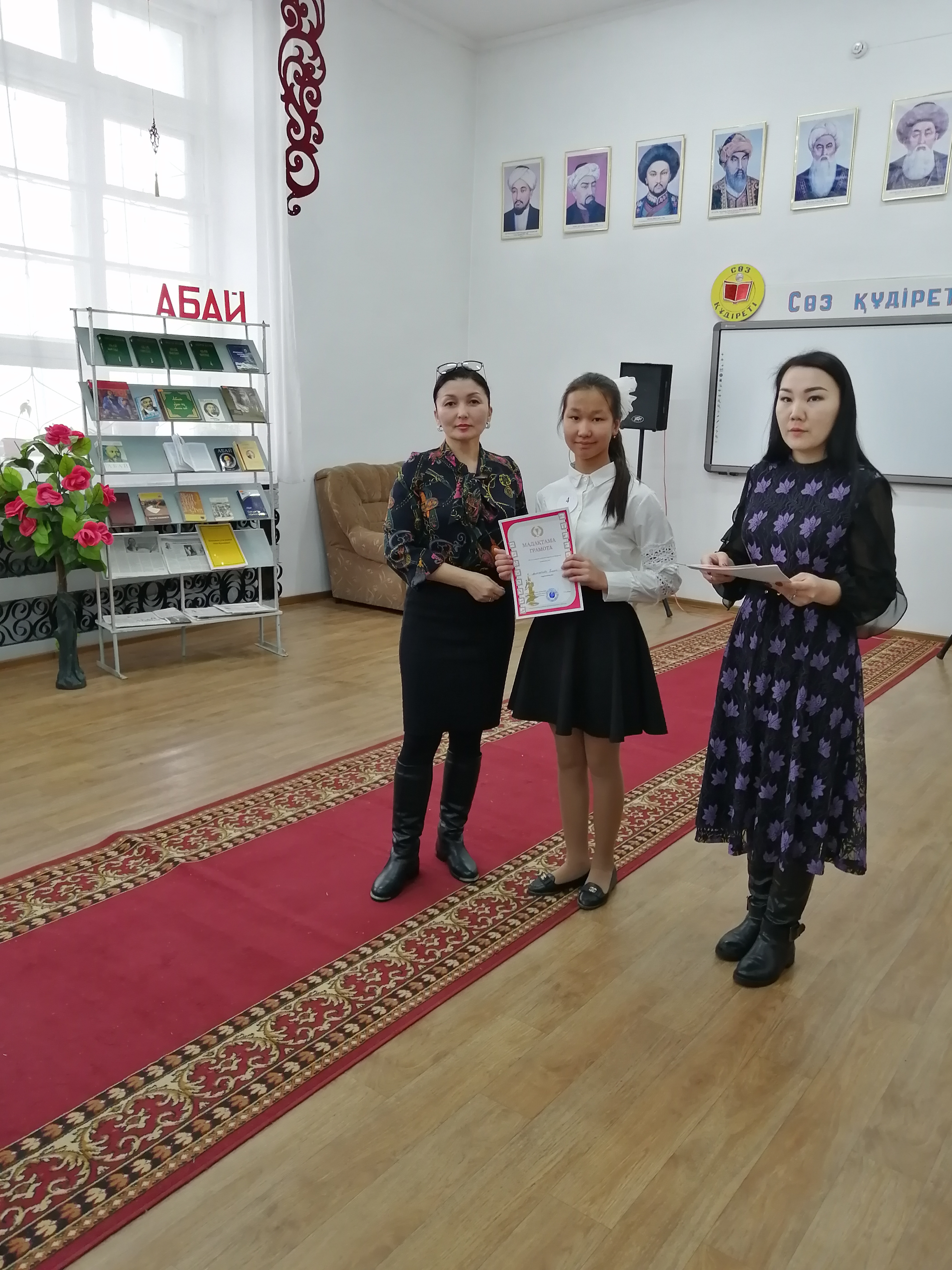 Байқау нәтижесінде бас жүлдені иеленген сонымен қатар сәуір айында болатын VІІ облыстық «Сөз құдіреті» мәнерлеп оқу байқауына жолдама алған .Қарасу ауылынан келген Төрежан Жансая .1- орынды Ә. Боранбаев атындағы жалпы білім беретін орта мектебінің оқушысы Шәкір Ақбота иеленді. 2-орынды Амангелді жалпы білім беретін орта мектебінің оқушысыӘбілғазы Айша мен Байғабыл ауылынан келген Нұрлан Мадина иеленді. 3- орынды Амангелді жалпы білім беретін орта мектебінің оқушысы базен Асылан мен Үрпек ауылынан келген Олжабекова Азида , Ы.Алтынсарин атындағы жалпы білім беретін оқушысы Нұрлыбекова Аруай иеленді.
