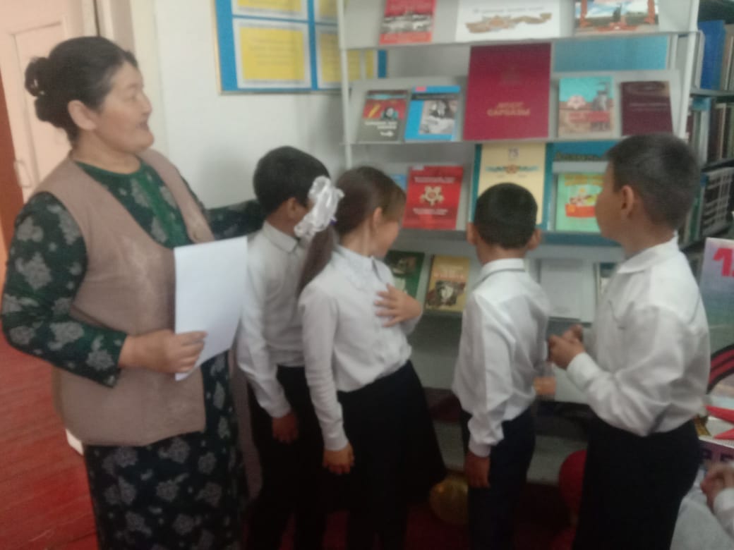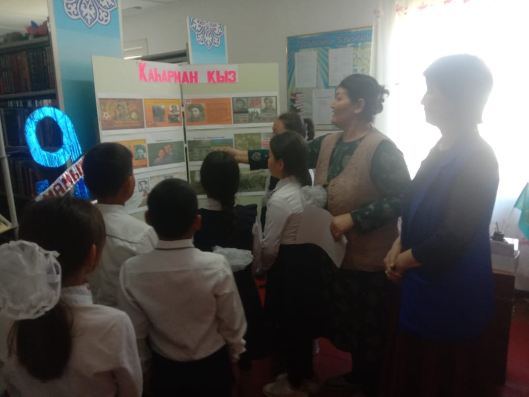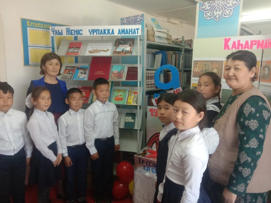 Құмкешу ауылдық кітапханасында 9 мамыр жеңіс күніне орай тәрбие сағаты өткізілді. Мақсаты: Аттары аңызға айналып, ерлік ісі барша ұлтты таң қалдырып, есімі тарих беттерінде алтын әріппен өрнектелген ерліктің мәңгі алауын жаққан қазақтың қызы Мәншүк Маметова жарқын өмірі және Ұлы Отан соғысындағы ерлік істерін ұрпаққа үлгі етіп, өнеге ету. Оқушыларды қазақтың қос аруы, шынары жұлдызы болған Әлия мен Мәншүк есімдерін қадірлеуге, қастерлеуге тәрбиелеу.Кітапханада өткізілген тәрбие сағатына Құмкешу орта мектебінің 4 сынып оқушылары мен сынып жетекшісі Исмайылова Гүлстан қатысты. Оқушылар «Ұлы Жеңіс ұрпаққа аманат» тақырыбында және М.Мәметованың туғанына 100 жыл толуына орай «Қаһарман қыз»тақырыбында жасалған сурет, кітап көрмелерін тамашалады. М.Мәметованың өмірбаянымен танысып, батыр бабаларымыздың ерлігі туралы жазылған кітаптармен танысты.