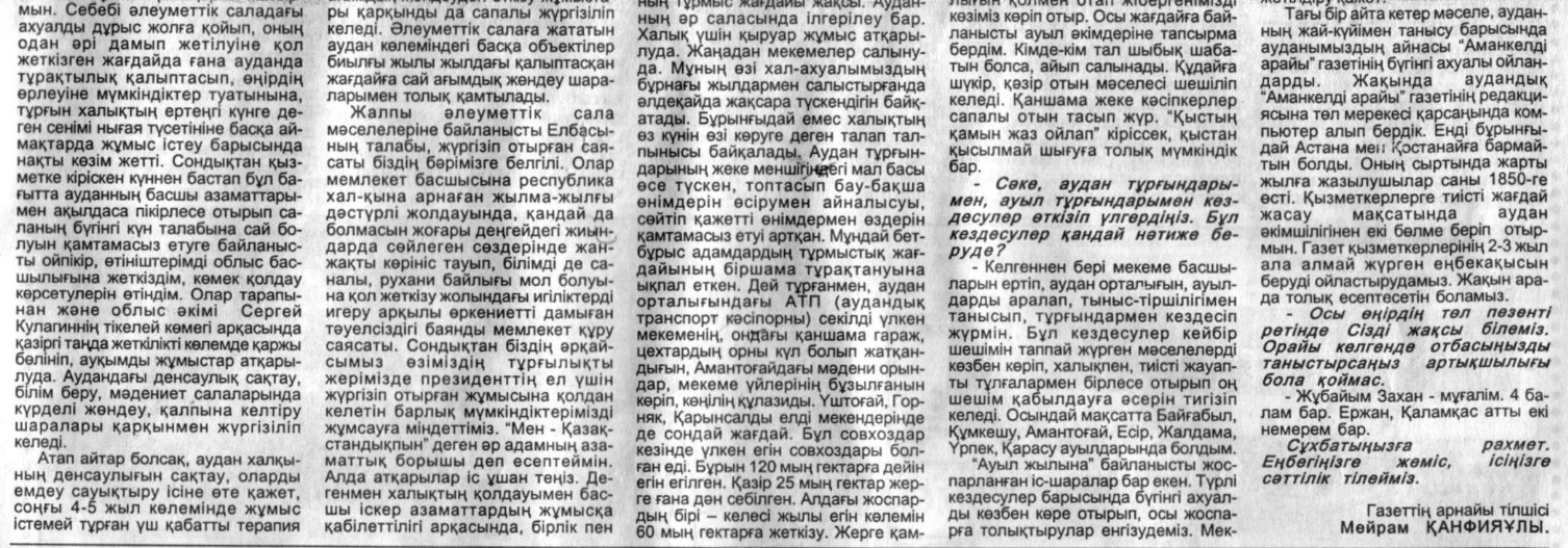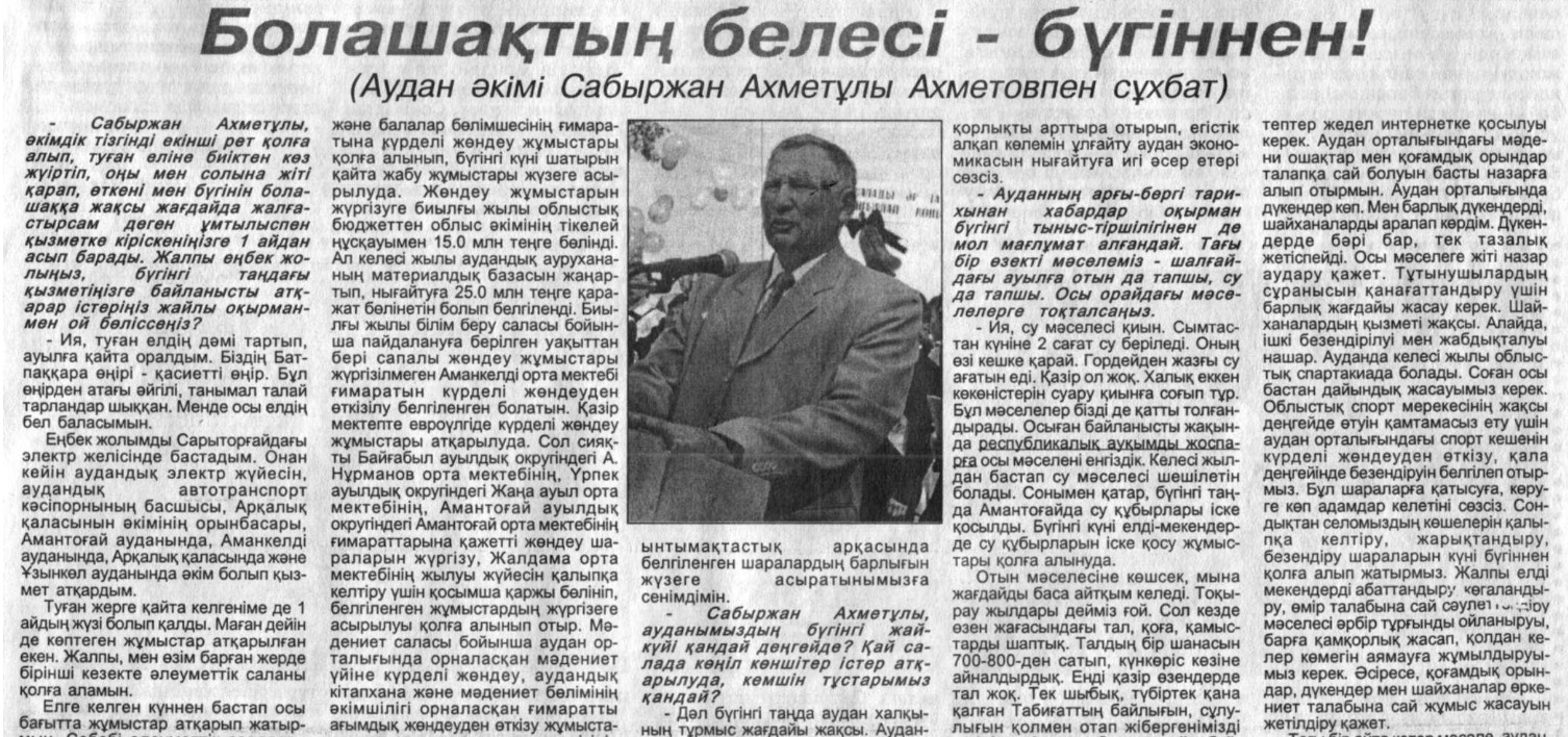 Болашақтың белесі-бүгіннен. (Аудан әкімі Сабыржан Ахметұлы Ахметовпен сұхбат) Аманкелді арайы. – 2004 – 9 шілде.
